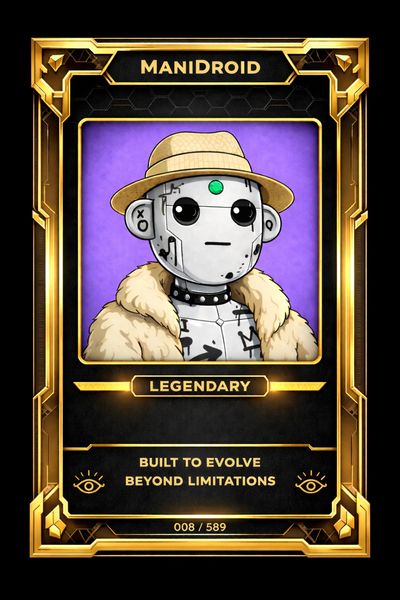 When you mint a ManiDroid NFT, you will also receive a digital ManiDroid trading card based on the exact NFT you minted. This card is designed in a premium black-and-metallic format and becomes part of a limited set of 589 total trading cards.